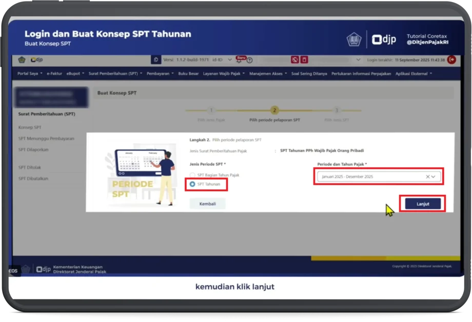 8. Selanjutnya pilih periode pelaporan SPT, pilih SPT Tahunan, tentukan periode dan tahun pajak (misalnya Januari-Desember 2025), lalu klik Lanjut.