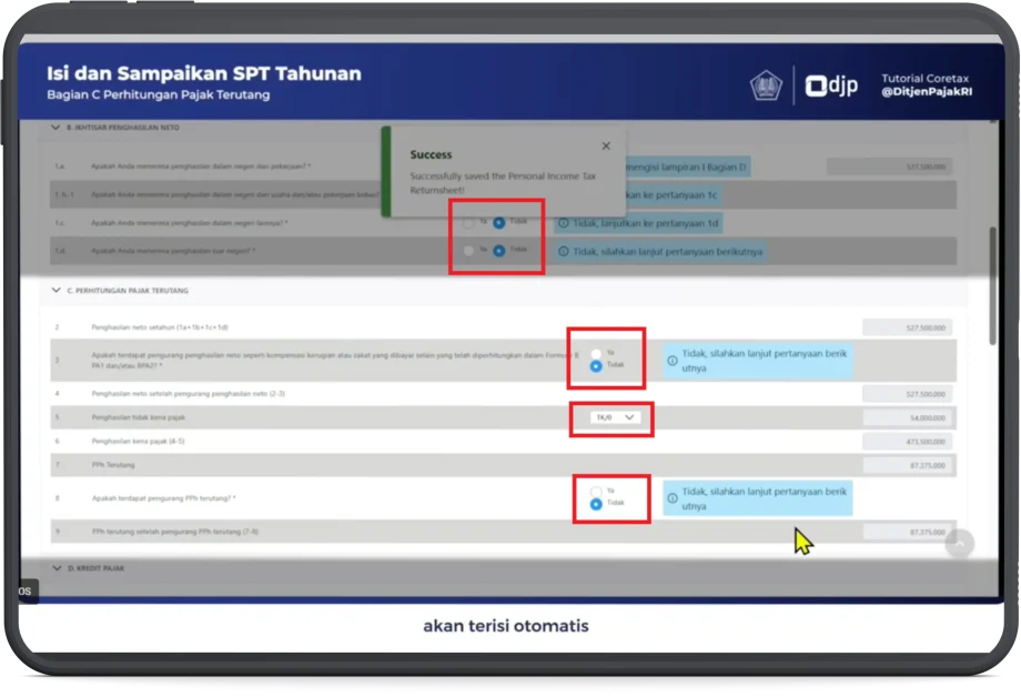 - Pada bagian C. Perhitungan Pajak Terutang, angka (2) akan terisi otomatis, angka (3) pilih Tidak, angka (4) terisi otomatis, angka (5) pilih PTKP sesuai dengan status wajib pajak [contoh: pilih TK/0], angka (6) & (7) akan terisi otomatis, angka (8) pilih Tidak, angka (9) akan terisi otomatis.