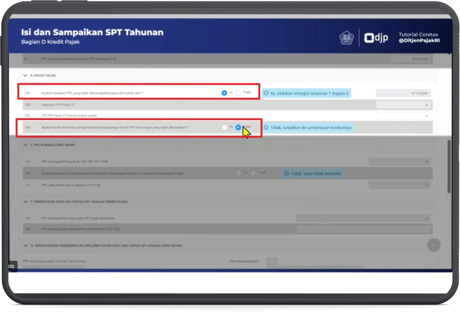 - Pada bagian D. Kredit Pajak, angka (10a) pilih Ya, angka (10b) & (10d) dapat dilewati, angka (10d) pilih Tidak.