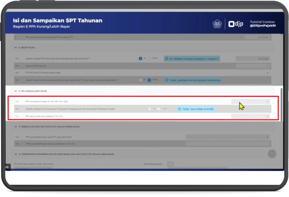 - Berikutnya bagian E. PPh Kurang/Lebih Bayar, angka (11a), angka (11b) & (11c) akan terisi otomatis.