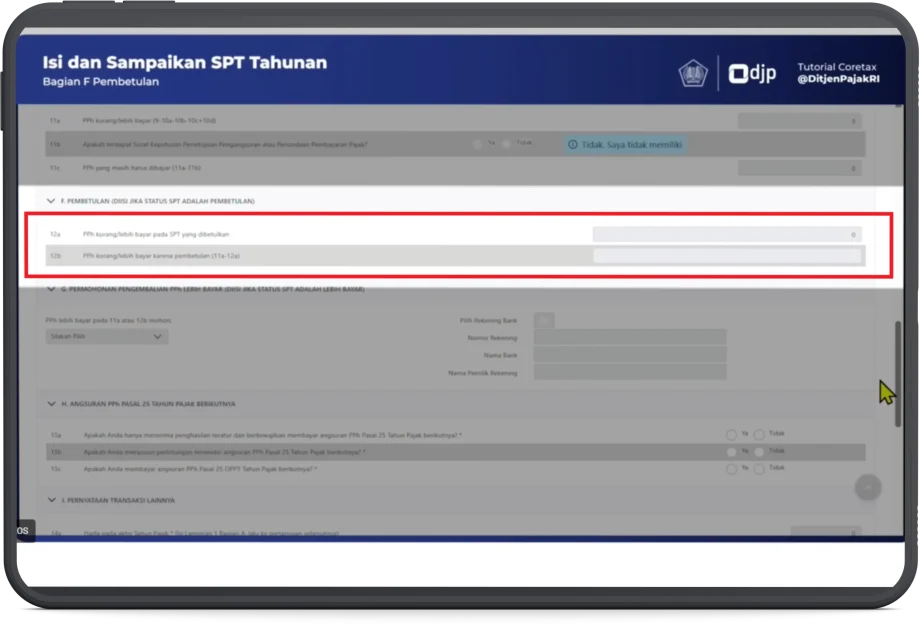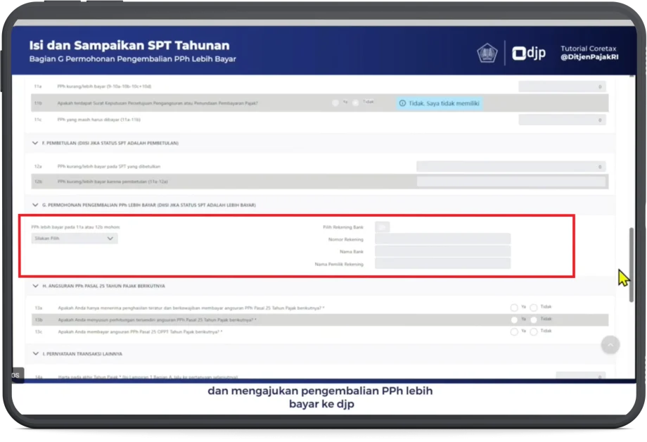 - Pada bagian G. Permohonan Pengembalian PPh Lebih Bayar, dilengkapi jika SPT Tahunan berstatus Lebih Bayar, dan mengajukan kelebihan bayar ke DJP.