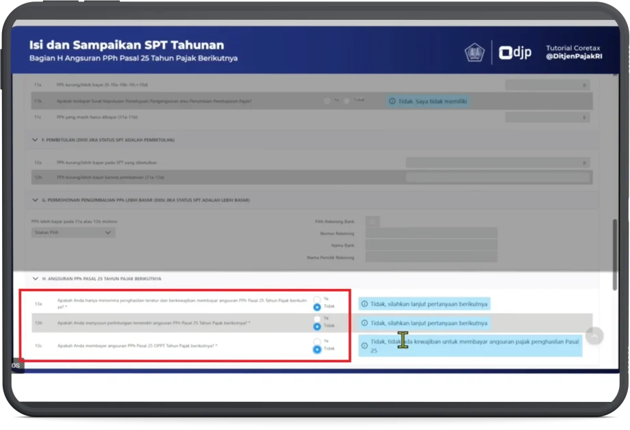 - Bagian H. Angsuran PPh Pasal 25 Tahun Pajak Berikutnya, angka (13a), (13b), dan (13c) pilih Tidak.