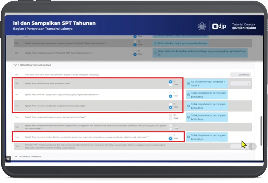 - Pada bagian I. Pernyataan Transaksi Lainnya, angka (14a) terisi otomatis, angka (14b) pilih Ya, angka (14c), (14d), dan (14g) pilih Tidak. Angka (14e), (14f), dan (14h) dapat dilewati.