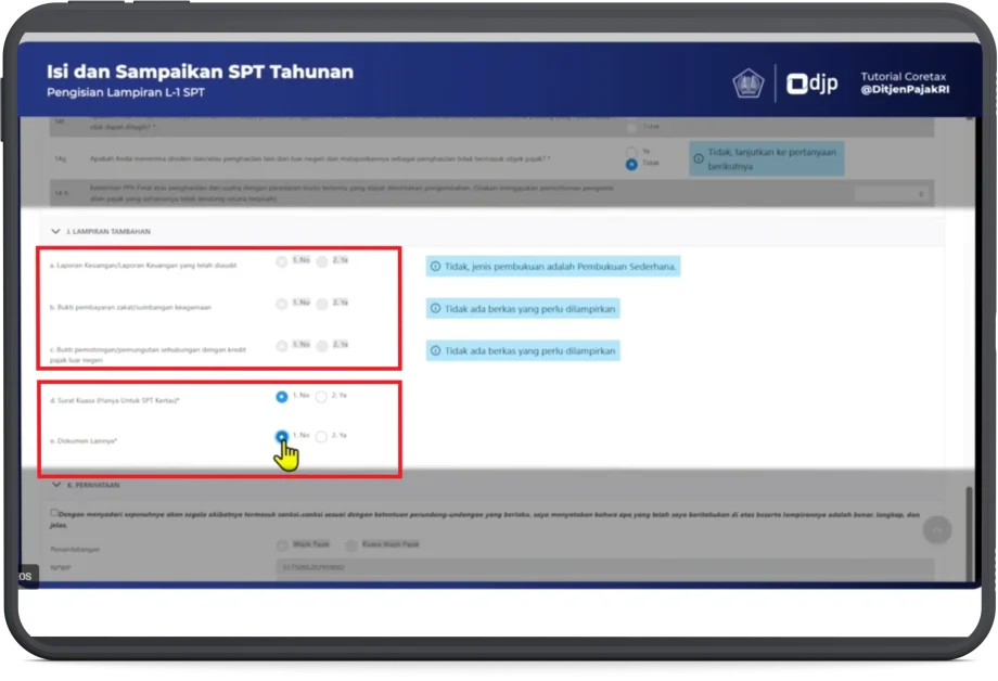 - Bagian J. Lampiran Tambahan, huruf (a), (b), dan (c) dapat dilewati. Huruf (d) dan (e) pilih Tidak.