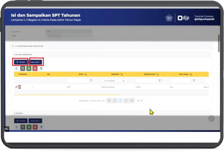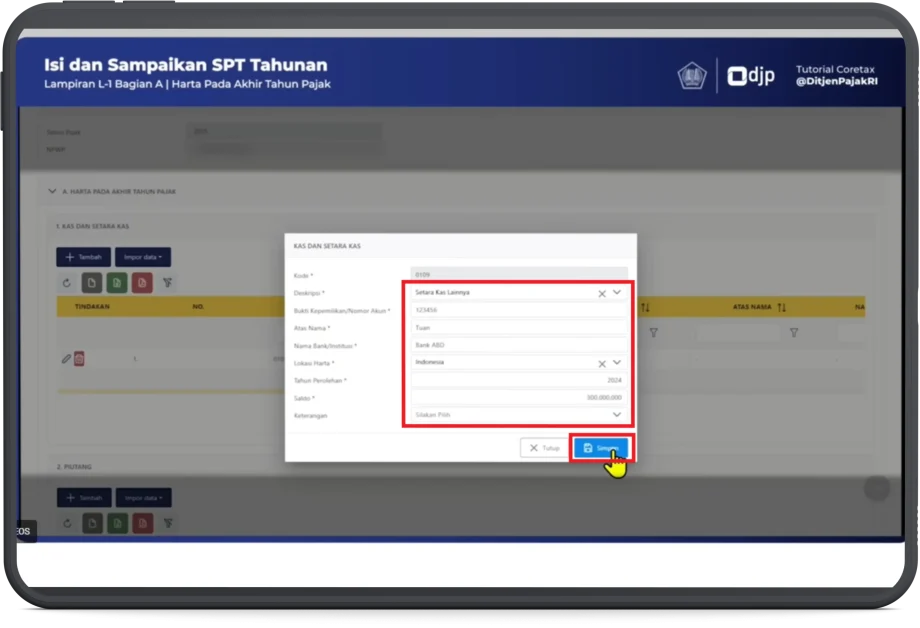 Sesuai ilustrasi kasus, terdapat harta berupa Kas dan Setara Kas, berdasarkan SPT Tahunan Tahun Pajak sebelumnya. Untuk mengubah nilai harta sesuai kondisi akhir tahun pajak pelaporan:
