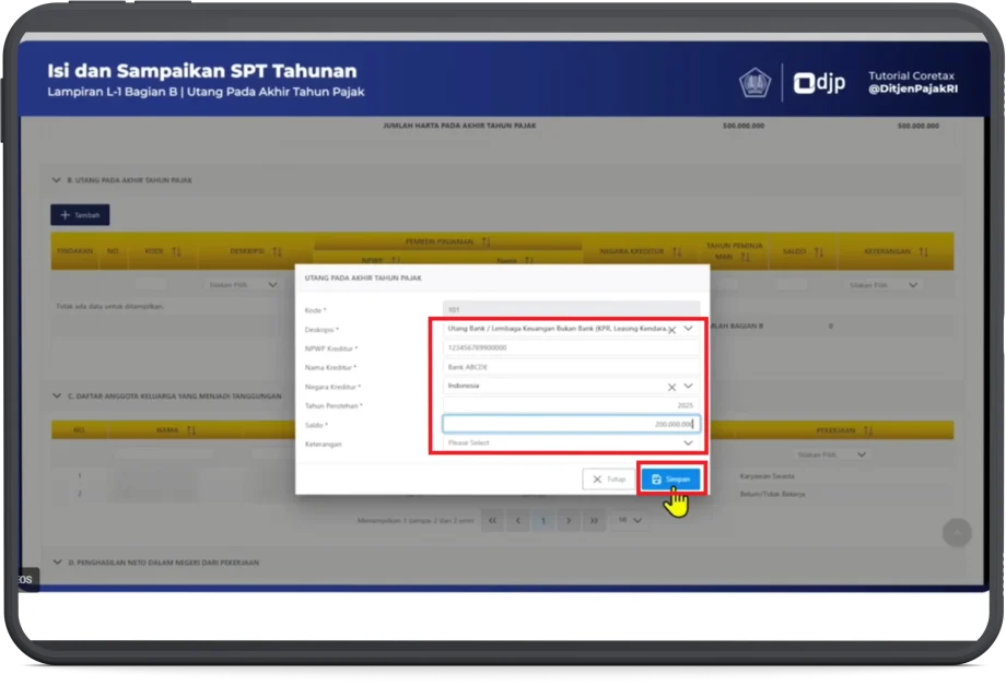 Sesuai ilustrasi kasus, wajib pajak hanya punya utang baru yang diperoleh pada tahun pajak 2025. Untuk memasukkan data utang: