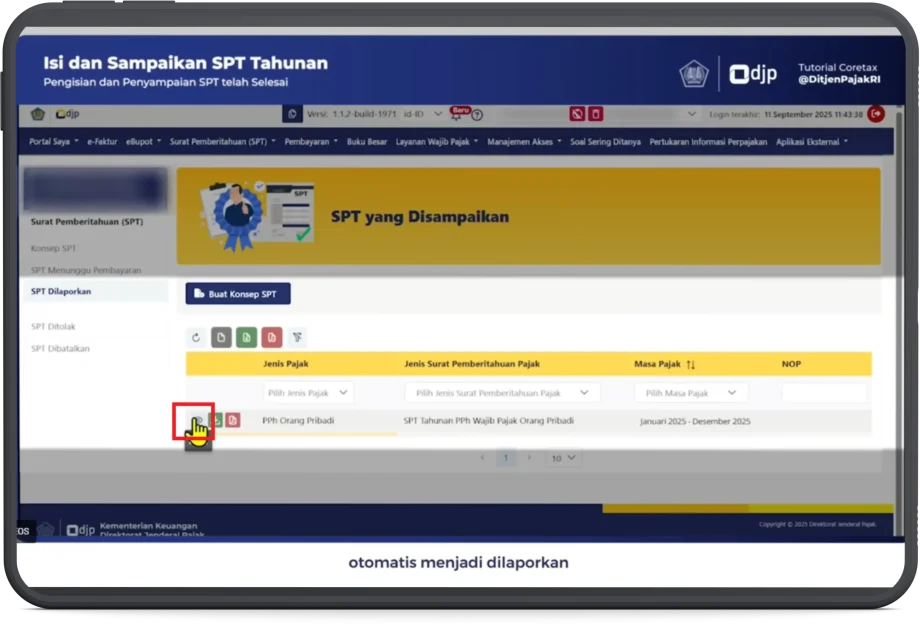 15. Status SPT Tahunan Pribadi akan otomatis menjadi dilaporkan.