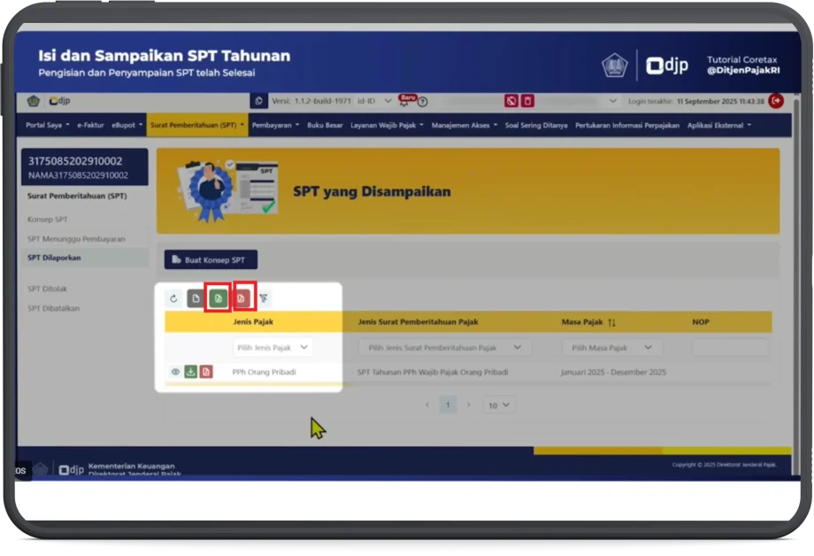 - Klik ikon unduh berwarna hijau, untuk mengunduh tanda terima pelaporan SPT atau Bukti Penerimaan Elektronik (BPE).