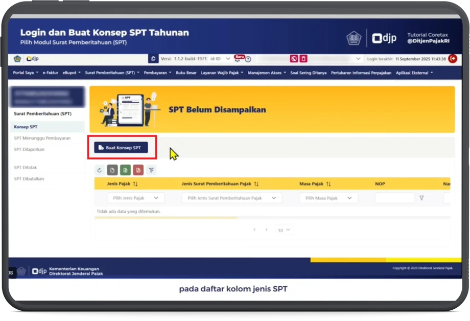 - Pada daftar kolom jenis SPT, klik Buat Konsep SPT.