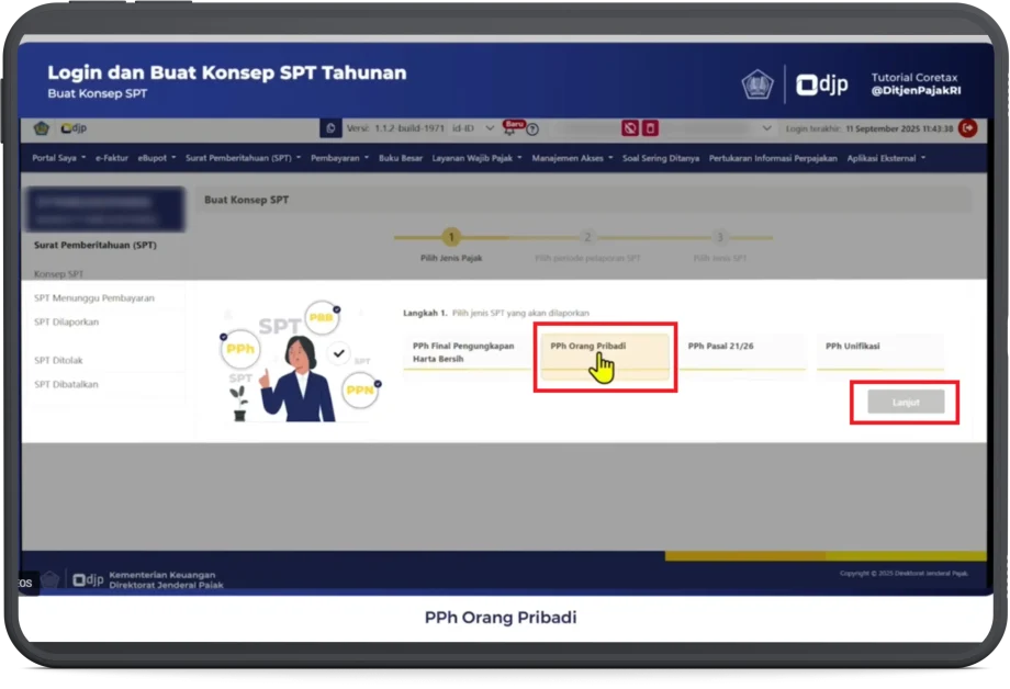 7. Berikutnya pilih jenis pajak PPh Orang Pribadi, kemudian klik Lanjut.