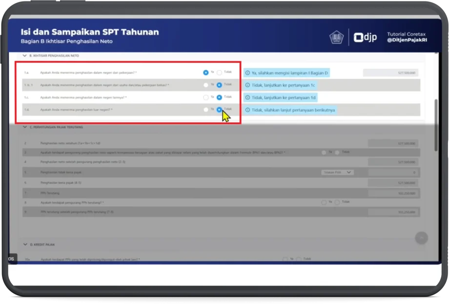 - Berikutnya pada bagian B. Ikhtisar Penghasilan Neto, angka (1.a) pilih Ya, pada angka (1.b.1) pilih Tidak, angka (1.c) pilih Tidak, angka (1.d) pilih Tidak.