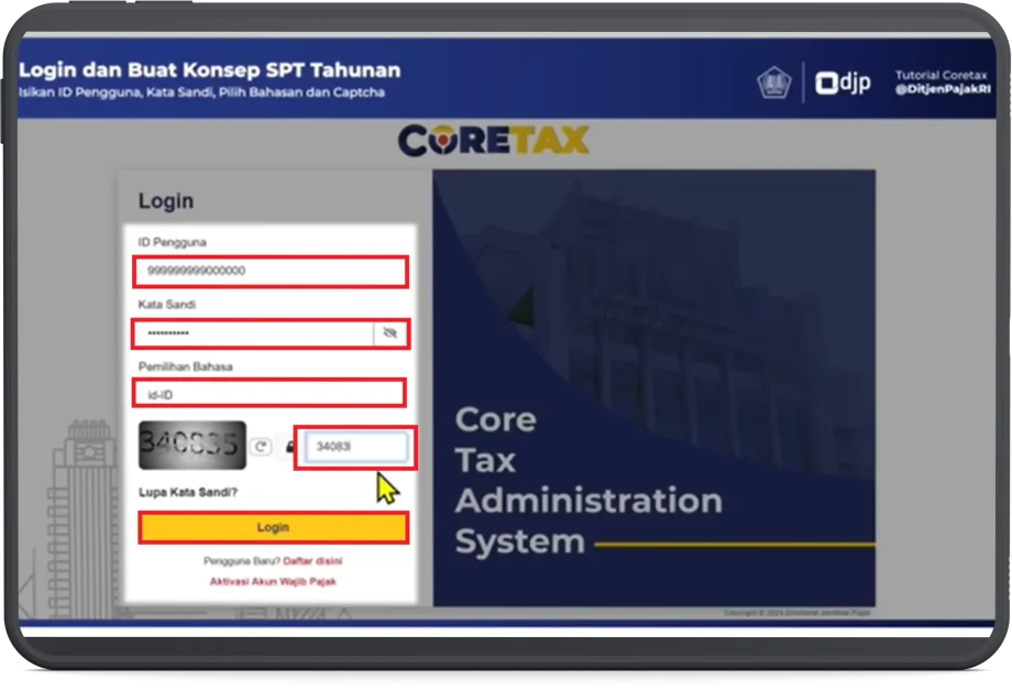 1. Login menggunakan NIK/NPWP dan password, pemilihan bahasa, di laman www.coretaxdjp.pajak.go.id/login/.